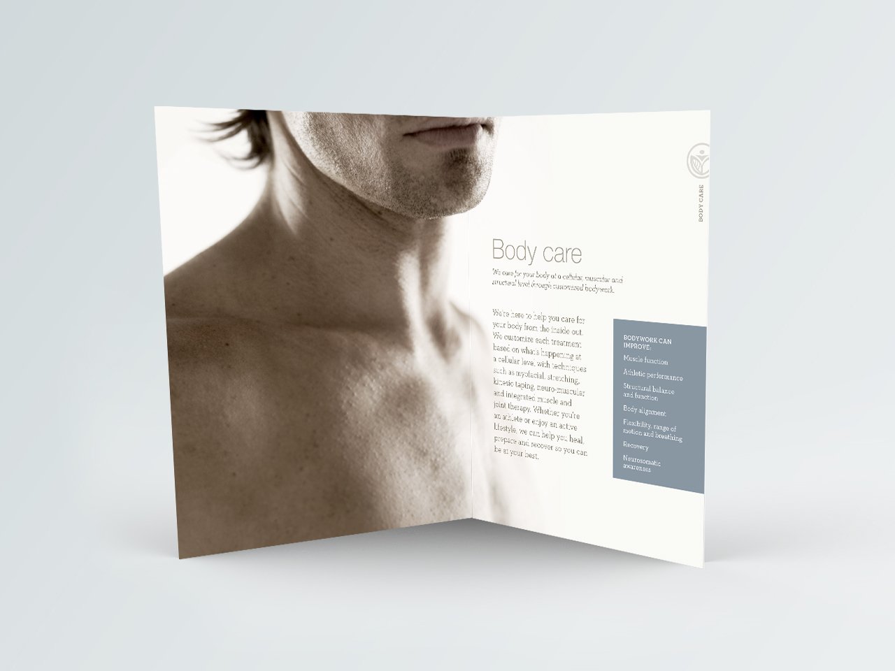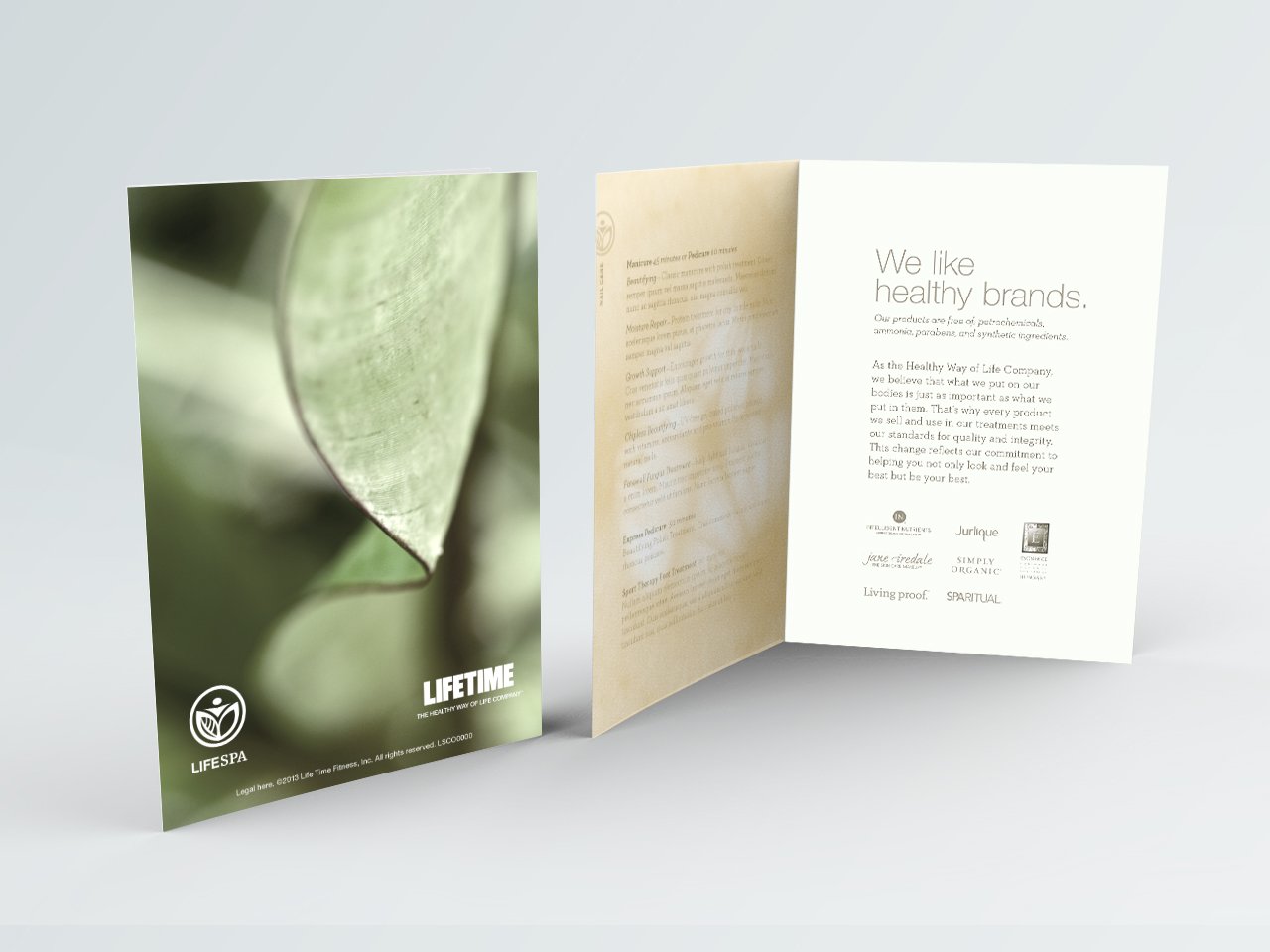 LifeSpa updated the tone, visuals and language surrounding the brand to mark their transition to organic and natural products and services. Natural beauty and healthy figures are are given a high level of prominence followed by the live, growing plants from which the products are created. The active, healthy adults that comprise the majority of their clientele were shifting to a less-processed lifestyle and providing a source for natural personal care was a logical extension of a service delivered by Life Time, The Healthy Way of Life Company.