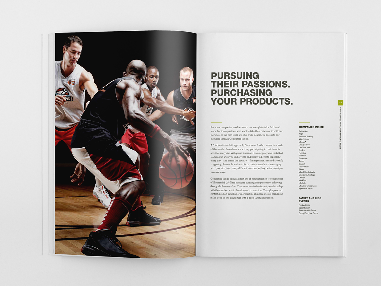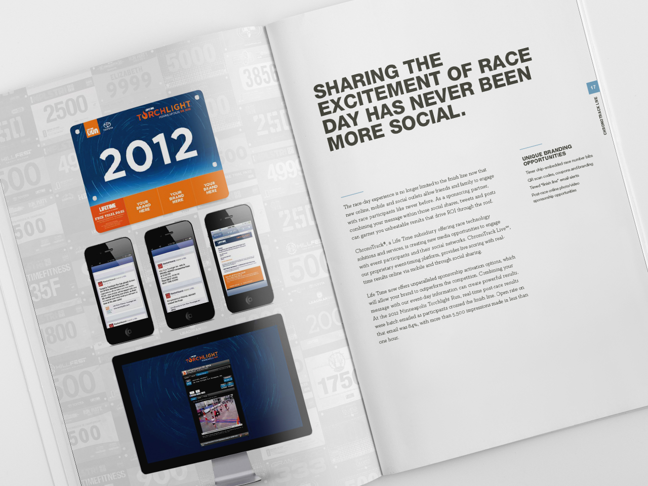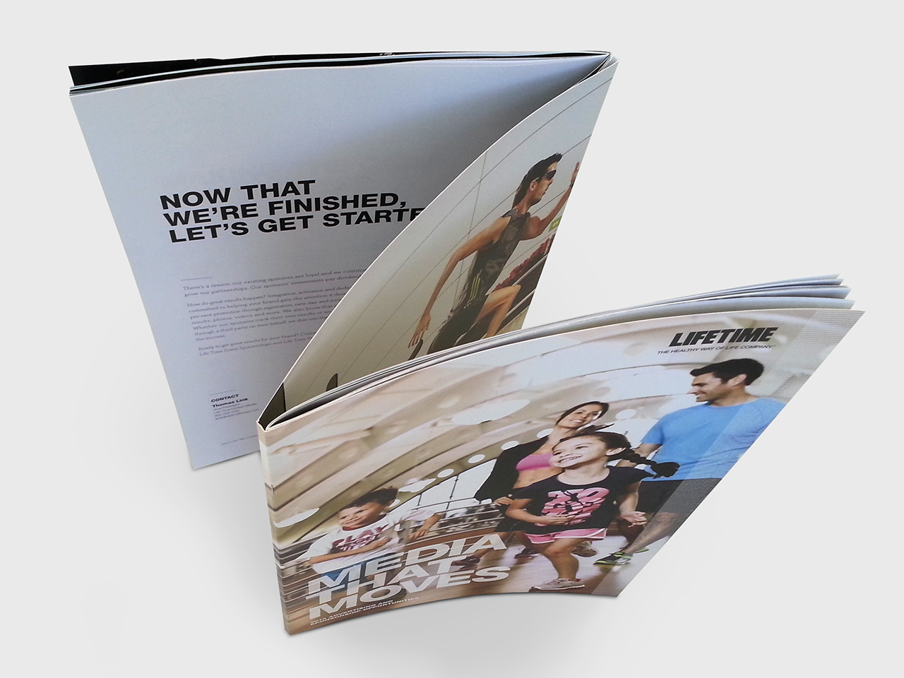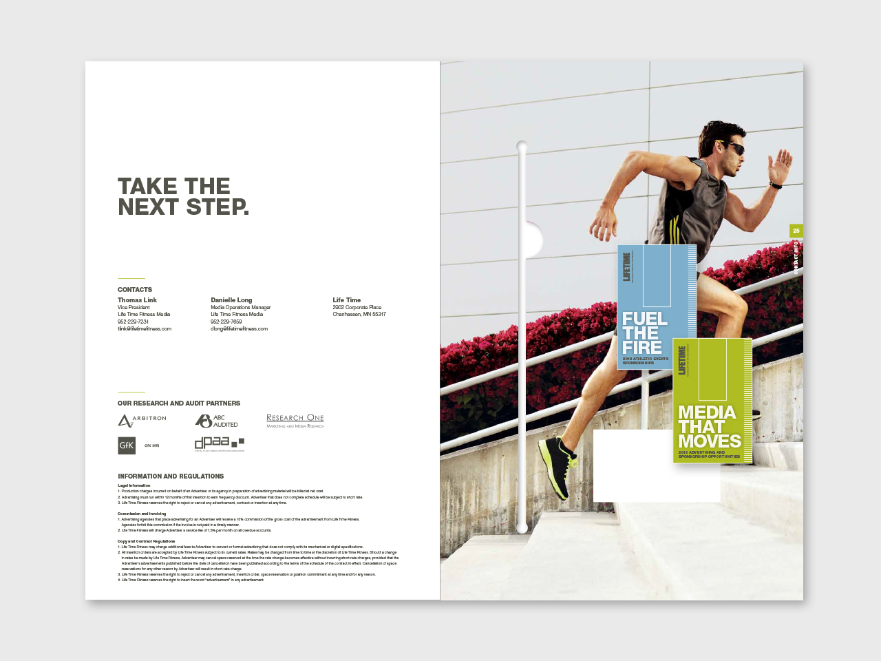 Life Time Media, the advertising placement division of Life Time, The Healthy Way of Life Company, needed to communicate the benefits of advertising at Life Time to two different yet overlapping groups—athletic event sponsors and consumer brands, most within the health and wellness space. In order to accommodate messaging to both groups within a single brochure, a dual-cover structure was designed to allow the piece to speak to each audience individually. The oversized piece was hand-delivered to key advertising prospects by the Media sales team. Included in the package were samples of Experience Life Magazine as well as a flash drive containing promotional videos and additional informational pieces.